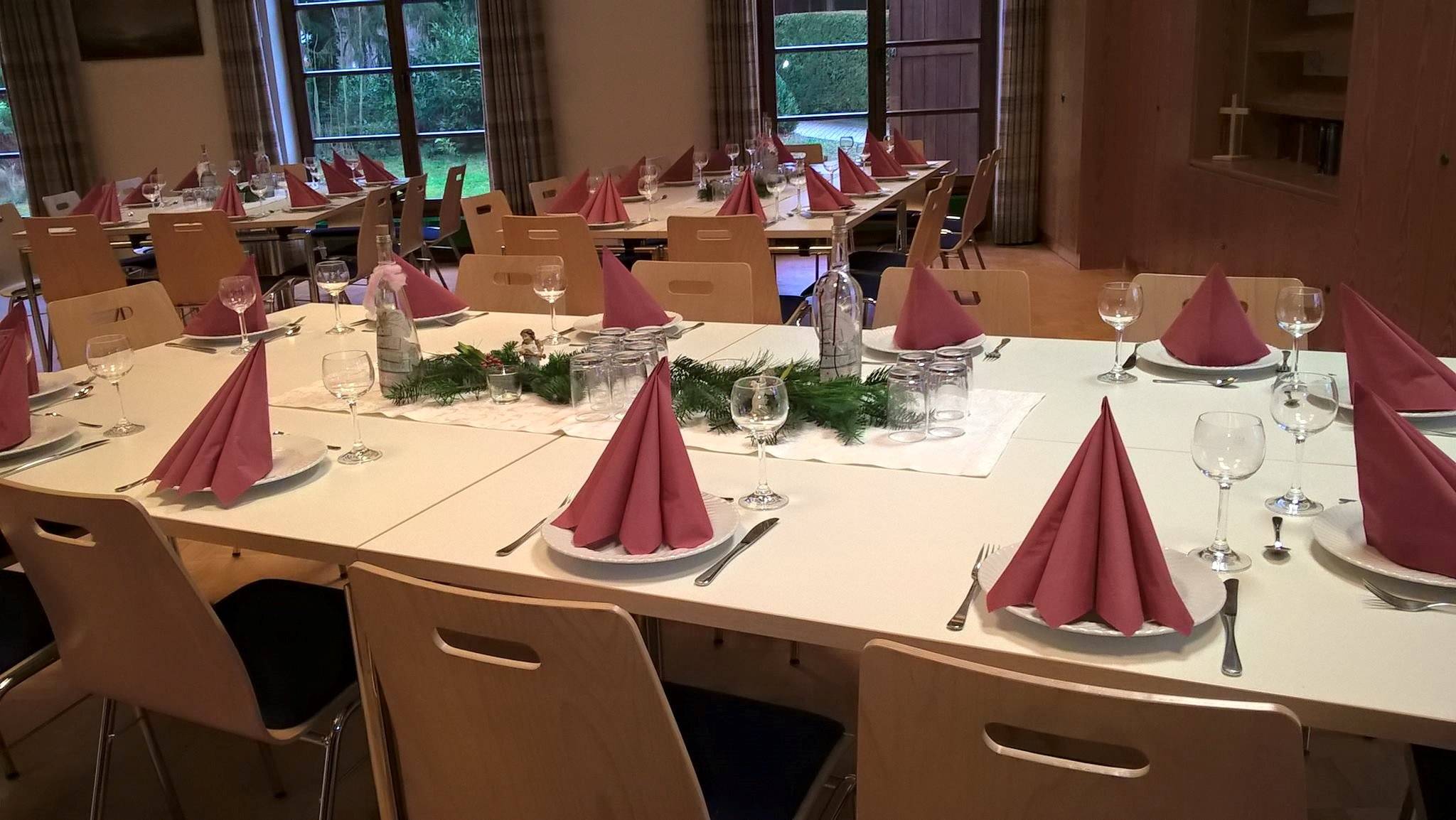 Evangelisches Gemeindehaus Gutach hergerichtet für ein Festessen mit 84 Personen. Gedeckte Tische mit Getränken und Besteck